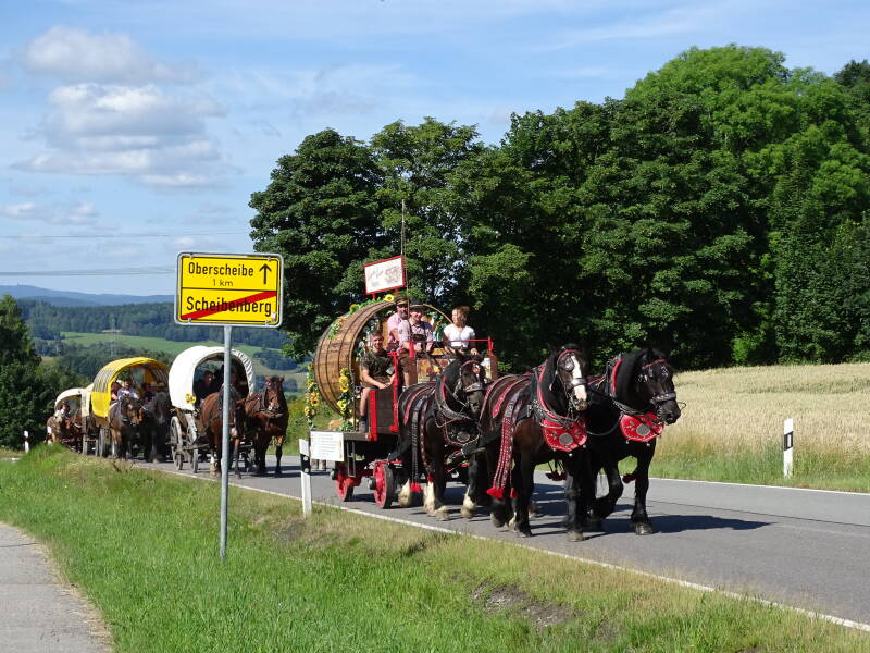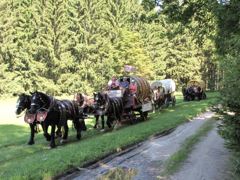 Die Freiberger Bierwagenroute des Freiberger Brauhauses in Kooperation mit unserem Pferdehof und dem Freiberger Bierkutscher Maik Reichel führt uns alljährlich knapp 200km mit Pferd und Wagen durch das Erzgebirge. Angeführt wird der Treck durch den 4-spännig gezogenen Freiberger Bierwagen, ein historischer Planwagen und ein Kremser für Tagesgäste mit einer Troika bespannt, vervollständigen das Ganze.